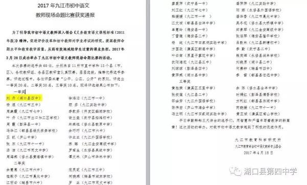 我校刘丹老师在3月28日九江市初中语文教师现场命题比赛活动中,从来自11所市直中学和13个县(市、区)的60名参赛选手中脱颖而出,成绩排名全市第一,荣获一等奖。